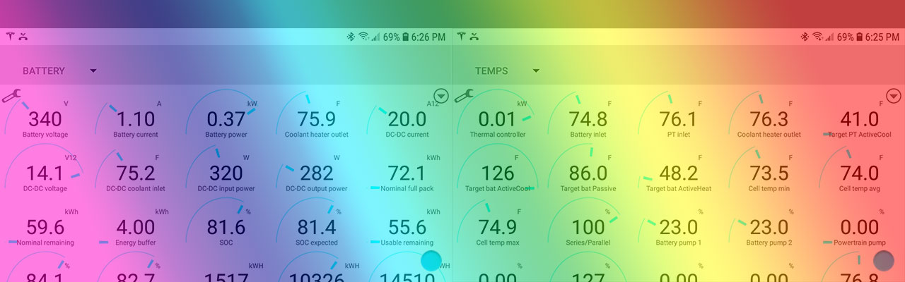 This example from the Scan My Tesla app first summarizes the battery data in the first two lines. Below that, it shows the battery module sub-group voltages, the temperatures, and highlights by color from the highest in bright amber to the lowest in black.